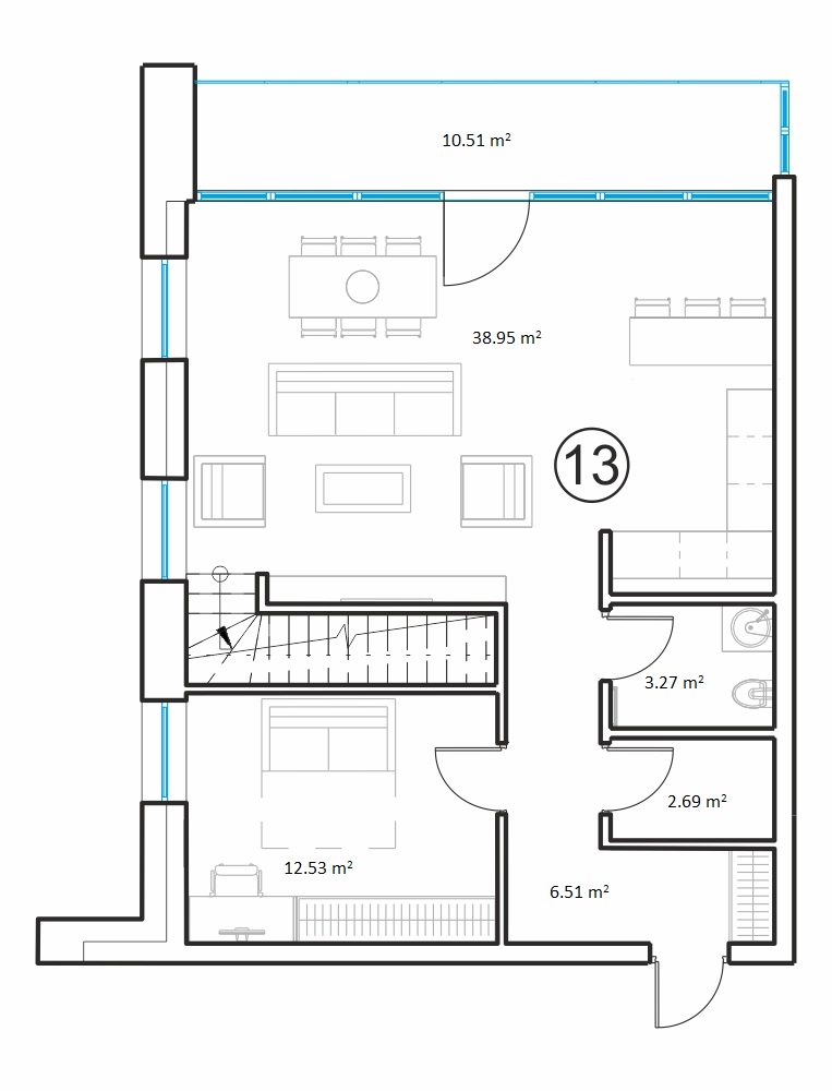 - Gyvenamasis kambarys su virtuve 38.95 m2