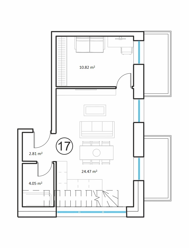 - Gyvenamasis kambarys su virtuve 24.47 m2