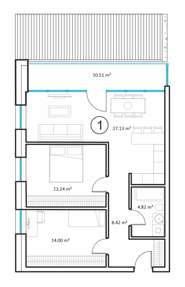 - Gyvenamasis kambarys su virtuve 27.13 m2