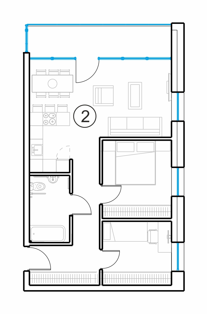 - Gyvenamasis kambarys su virtuve 26.40 m2