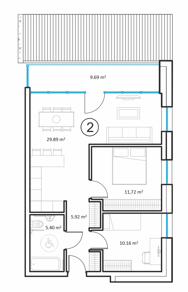 - Gyvenamasis kambarys su virtuve 29.89 m2