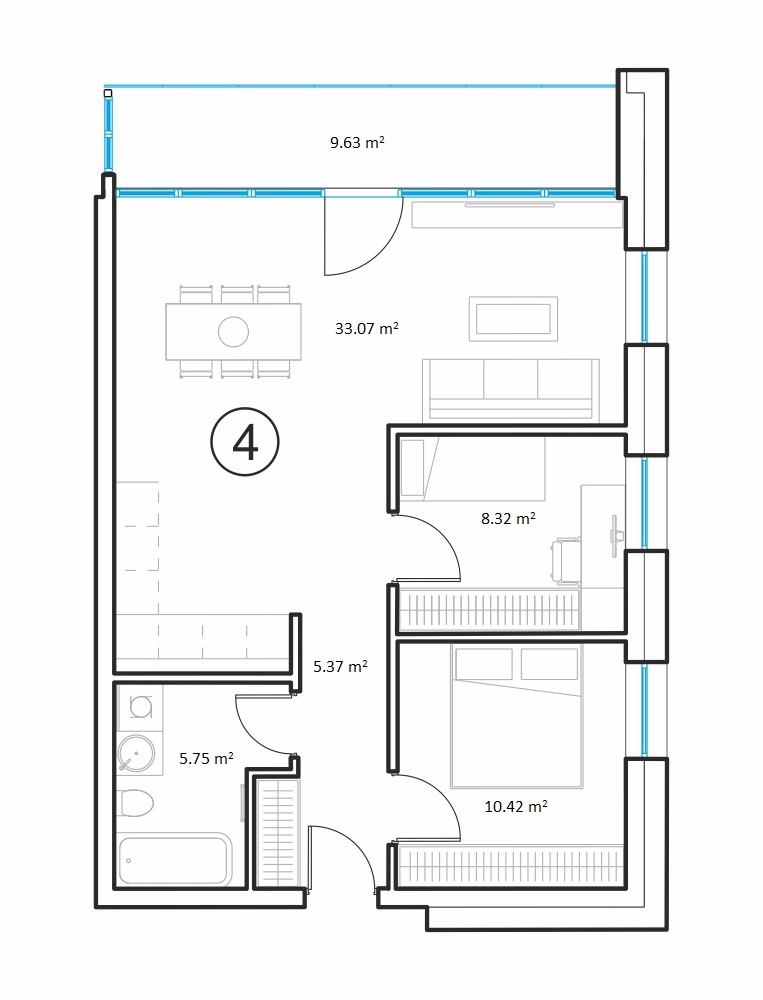 - Gyvenamasis kambarys su virtuve 33.07 m2