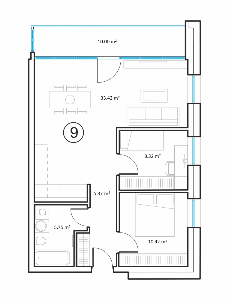 - Gyvenamasis kambarys su virtuve 33.42 m2